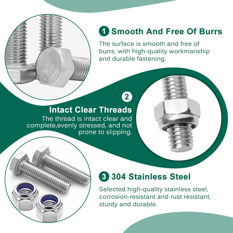 - Bolts And Nuts Set: 304 stainless steel hexagonal bolts with high-strength nylon anti-loosening nuts can provide excellent fastening performance. whether facing high-intensity vibration environment, or harsh weather conditions, nuts and bolts assortment can ensure a solid and secure connection.