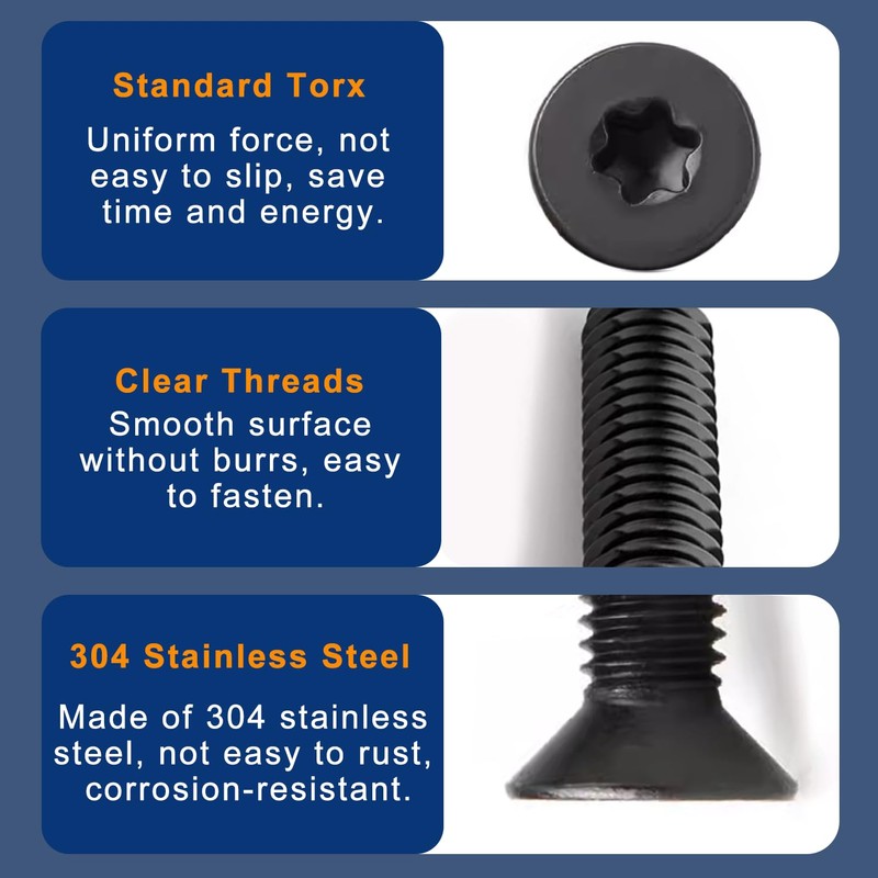 - High-quality material: countersunk head screws Torx are made of A2 V2A stainless steel, which has good corrosion resistance and excellent strength and hardness properties, which can ensure the screws have a long service life.