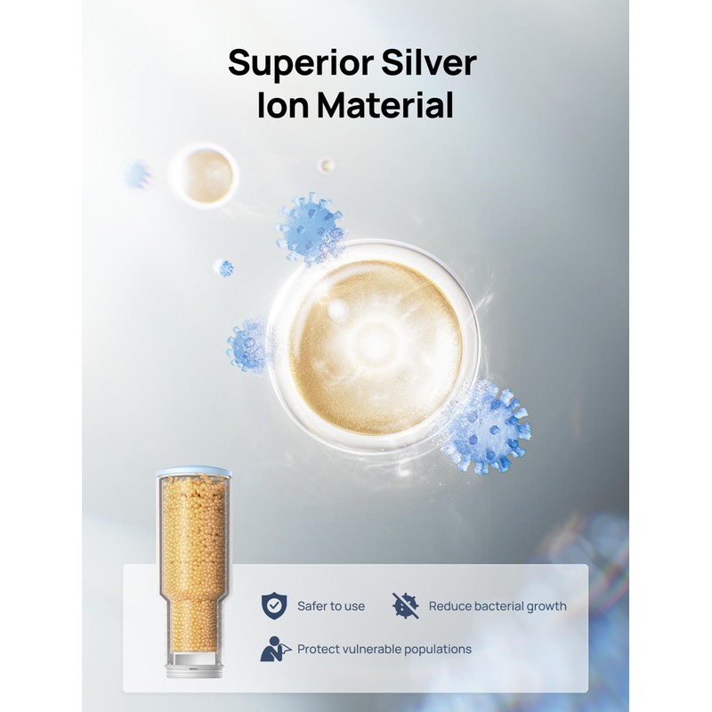 - : The three-layer cleaning system and the large silver ion pellets have a higher contact surface, helping clean more water before it is released into the air.