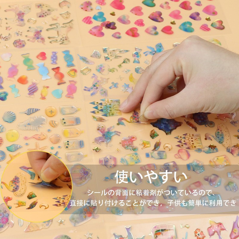 - Sparkling Puffy Stickers: These cute stickers are translucent with beautiful colors that have a 3D feel. There are approximately 20 to 30 stickers per sheet. There are 12 sheets so you can use them without worrying about the number of sheets