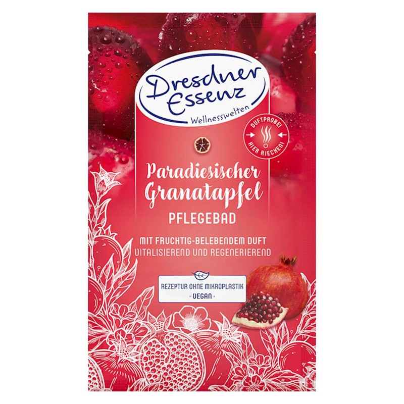 - The Dresdner Essenz paradise pomegranate bath for women contains 60 g. You will receive a pack of 12. One bag is enough for a full bath.