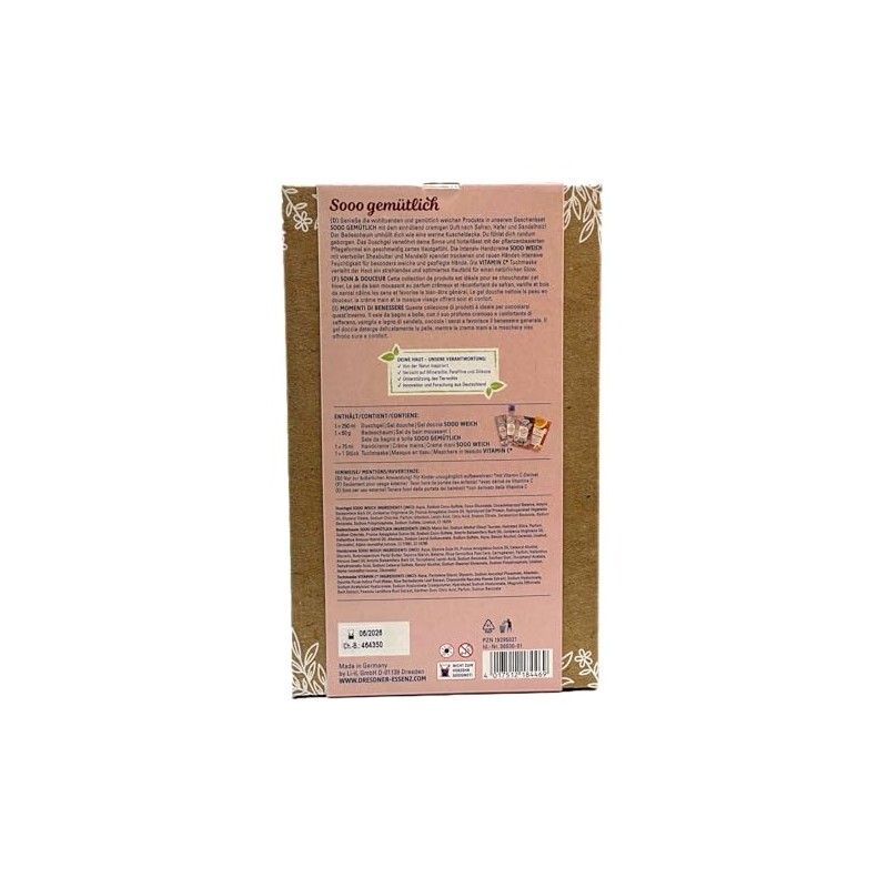 - The bath foam wraps you like a warm blanket. You feel safe all around. The shower gel pampers your senses and leaves a smooth, delicate skin feeling with the plant-based care formula. The intensive hand cream SOOO SOFT with valuable shea butter and almond oil provides intensive moisture to dry and rough hands for particularly soft and nourished hands. The Vitamin C* cloth mask gives the skin a radiant and optimised complexion for a natural glow. *Vitamin C derivative. Contents: 1 x 250 ml shower gel, Sooo soft, 1 x 60 g bath foam, Sooo cosy, 1 x 75 ml hand cream, Sooo soft, 1 x cloth mask vitamin C