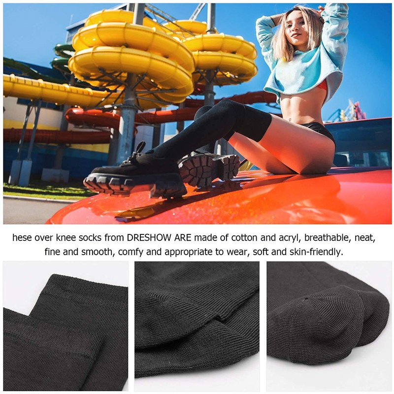 - SOFT AND STRETCHY - These over knee socks from DRESHOW are made of 80% acrylic, 15% spandex, 5% nylon, breathable, neat, fine and smooth, comfy and appropriate to wear, soft and skin-friendly. The sock edge makes sure the socks won’t fall off.