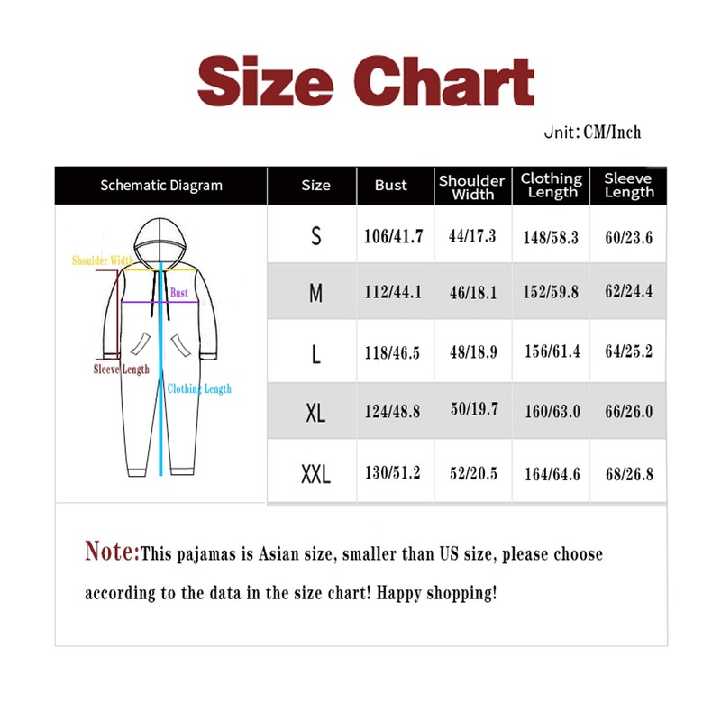 - ★ Note: 1- There is only one black one-piece pyjamas in this product link; 2- The jumpsuit is available in Asian sizes, which are smaller than European sizes. Please choose a size according to the information in the size chart before purchasing; 3- To prevent the one-piece pyjamas from being damaged during storage and transport, we vacuum it and the clothes will be creased after removing. Washing or steam ironing will make it fluffy and soft again.