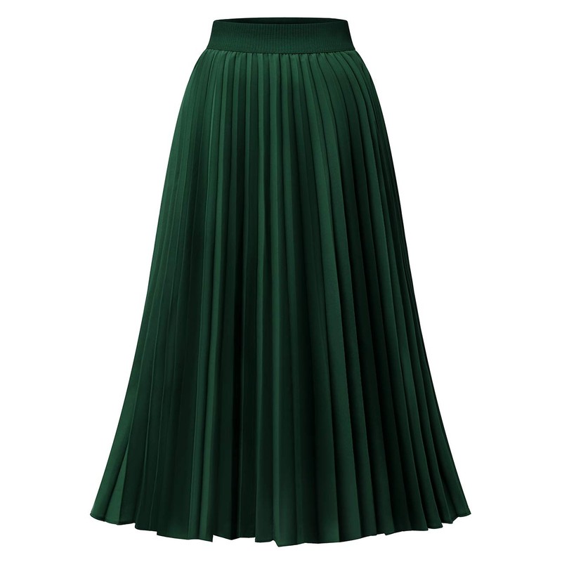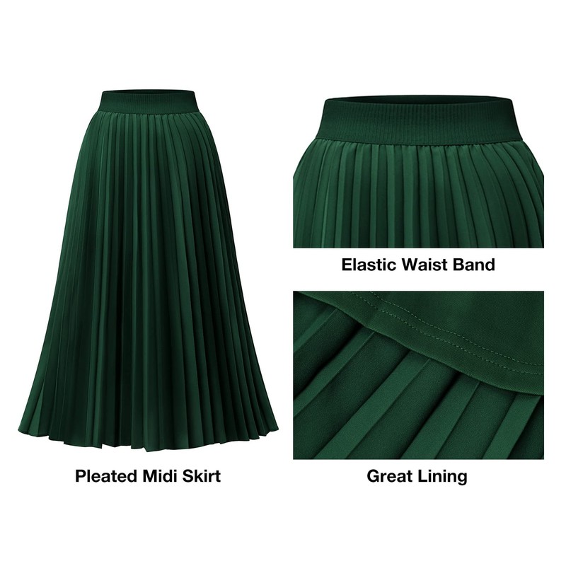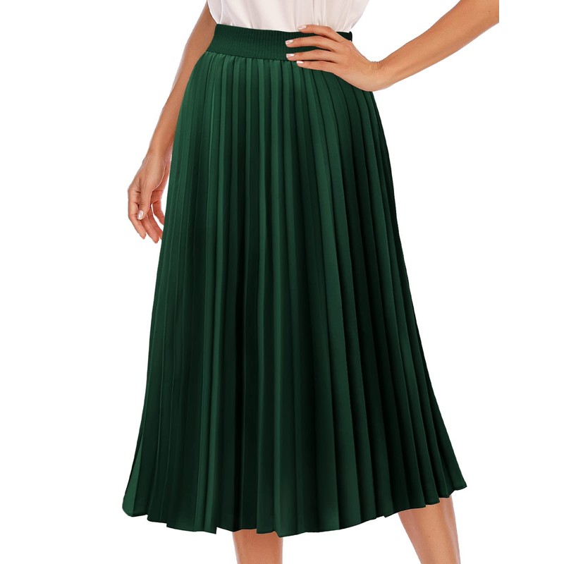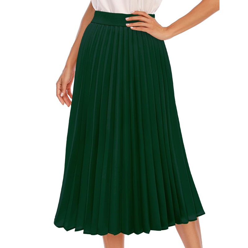 DRESSTELLS Pleated Midi Skirts for Women, Aline Long High Elastic Waisted Summer Flowy Chiffon Swing Skirt, Darkgreen, Large