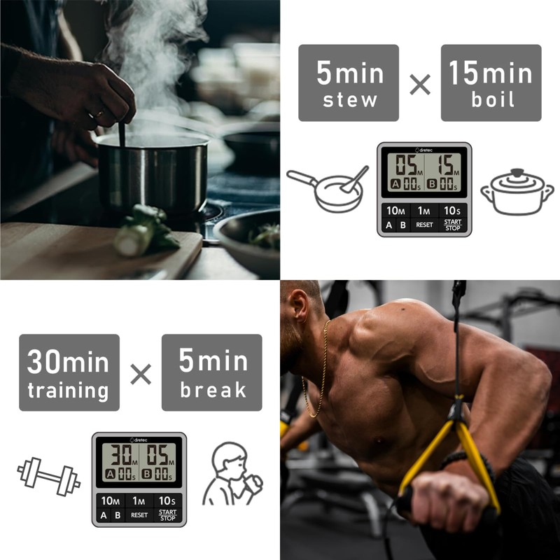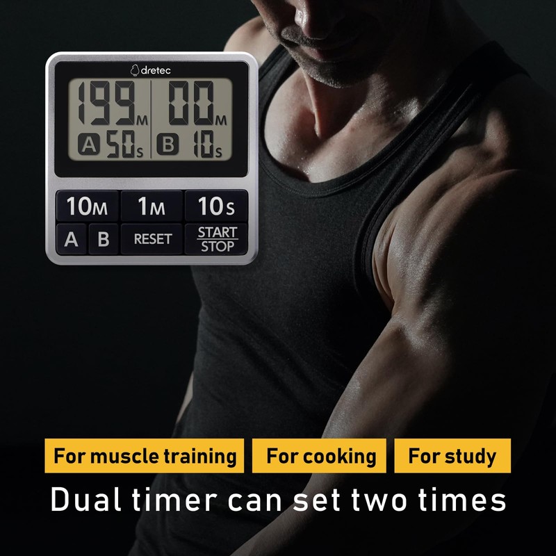 - You don't have to have 2 timer since you can measure 2 times at the same time. You can use it as a boiling time and measuring Bake time with B. It can be set for a long period of time up to 199 minutes and 50 seconds, so it is recommended not only for cooking but also for managing time in study. For example, a 5 minute break after 30 minutes study, you can concentrate on studying by determining the time and repeat