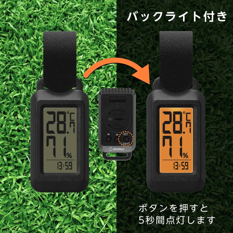 dretec Portable Thermometer/Hygrometer, Splashproof, IPX4, Clock Function, 5 Second Measurement, Backlight, Portable, Mountaineering, Biking, Camping, White