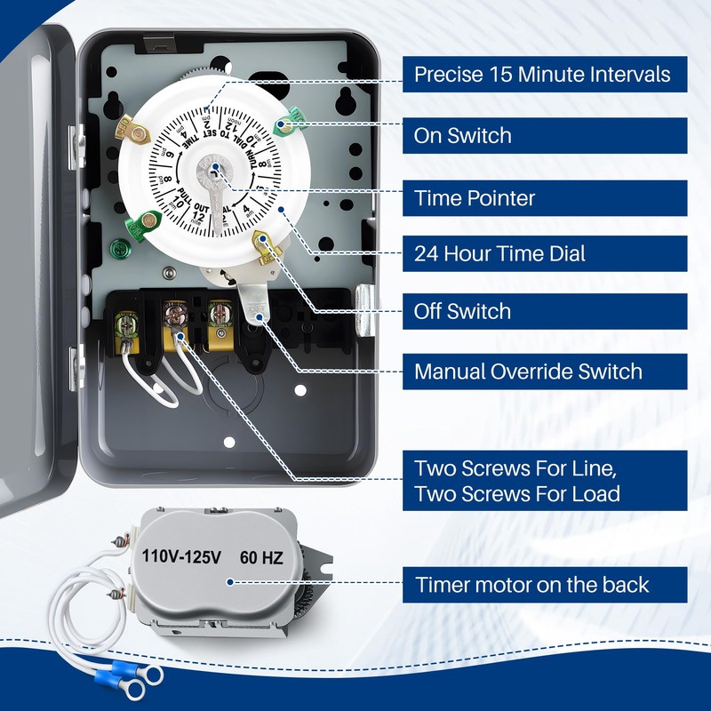- Reliable Time Based Control: industrial grade pool pump timer could automate your pool pump to save energy, pool time switch with manual override switch provides added convenience, which is suitable for controlling pool pumps, outdoor lighting, irrigation systems and other high power devices