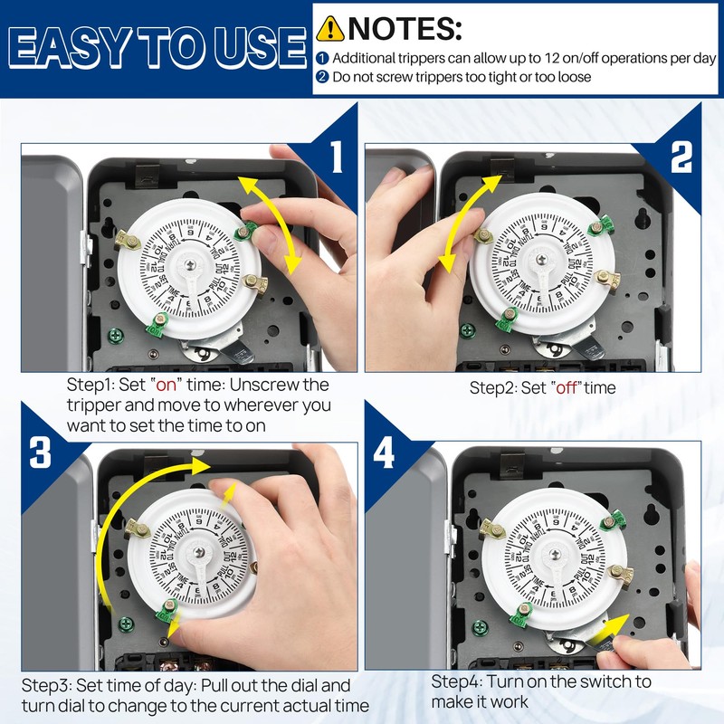 - 24 Hour Maximum 12 Times ON/Off: Package comes with 2 ON Tripper and 2 OFF Tripper, which could achieve direct 24 hour control of most loads, allow up to 12 times ON/OFF operations each day with minimum ON/OFF times of 15 minutes for precise scheduling. Besides, ON-OFF switch also allows manual control without changing timer settings