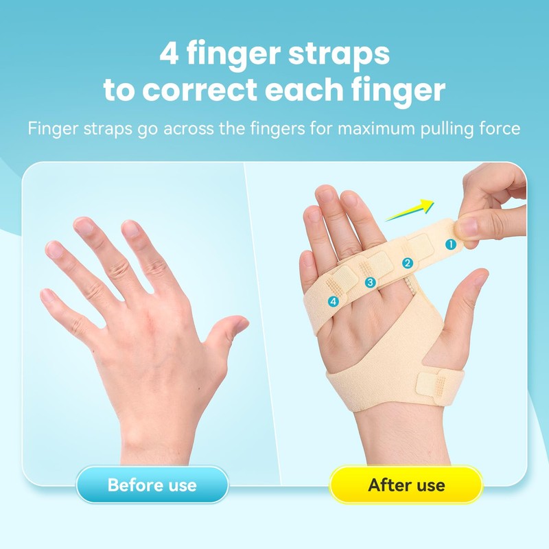 - 4 finger bands, freely adjustable: This finger ulnar deviation splint is equipped with 4 flexible and adjustable finger straps (Velcro fastener) on the index finger, middle finger, ring finger and small finger. The design adapts to the natural contour of the finger and can be freely adjusted to a comfortable tension state, which can not only pull the finger back to the normal position, but also relieve the discomfort caused by the ulnar deviation.