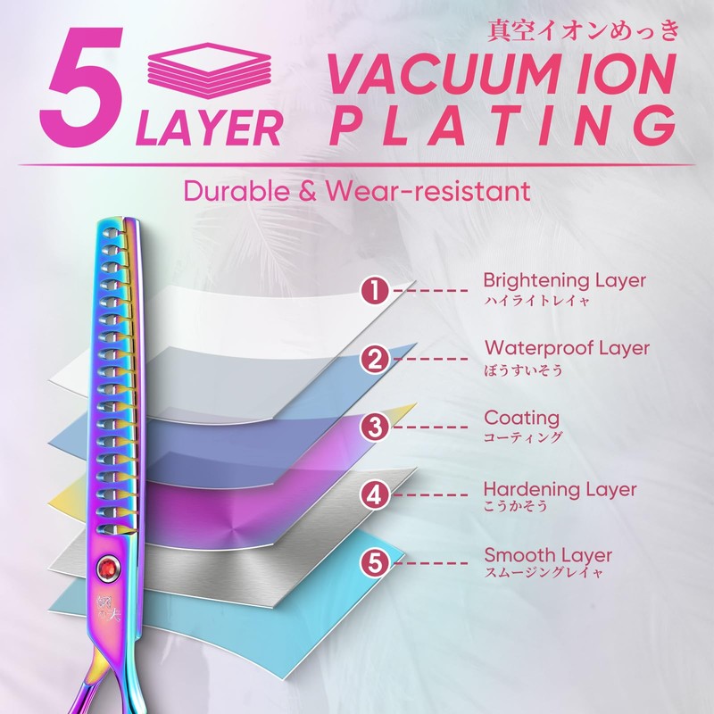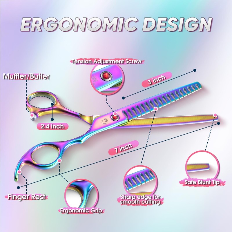 - Stunning & Unique Design: Our pet chunker scissors feature a charming colors inspired by nature's rainbow. They add a touch of style and uniqueness to your pet grooming. In addition, the titanium coating and cold treatment technology ensure the durability and corrosion resistance of the scissors, providing pet groomers with a smooth and quiet cutting experience while extending the life of the scissors!