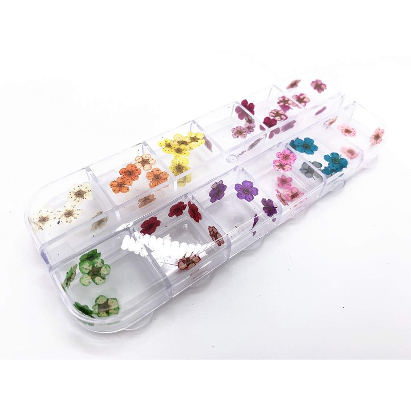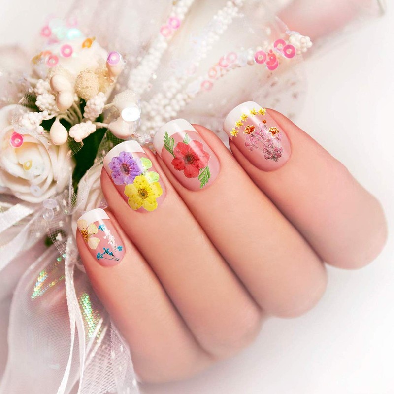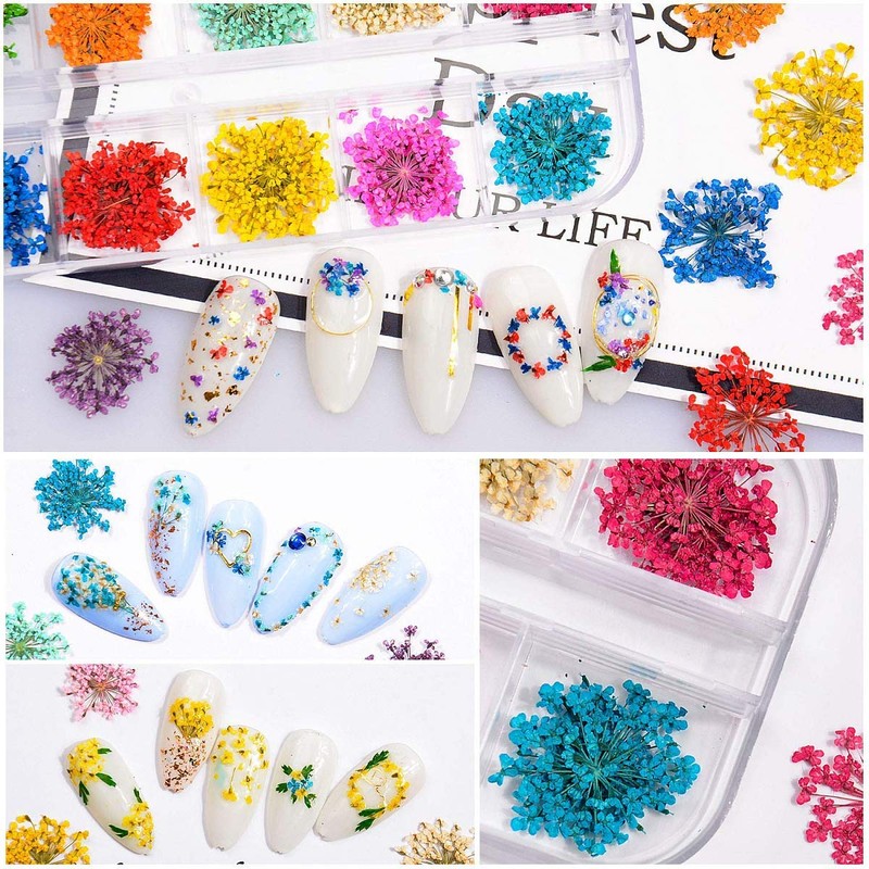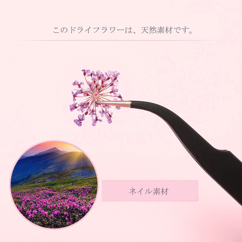 - [How to use] Clean the surface of the nail, brush the base with a polishing agent, then put dry flowers on the nails with tweezers, and finally coat the surface with a layer of clear protective oil