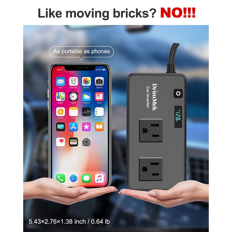 - Compact 12V to 120V Car Power Inverter - Slightly larger than a smartphone at just 5.432.761.38 inches & 0.64lb, this ultra-portable car AC adapter fits anywhere. Delivers full 110V/120V power (NO 24V/48V) through car power converter for plug outlet. Perfect car plug in adapter outlet for car trips - powers tools, tech, and devices effortlessly. The ideal compact power inverters for vehicles car plug adapter for road warriors and commuters