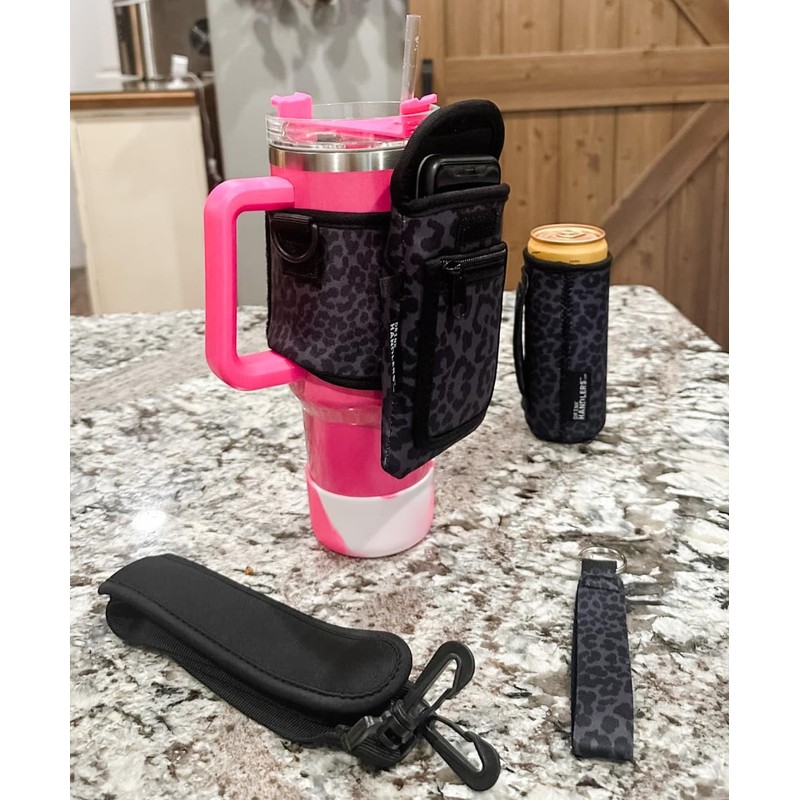 Drink Handlers Around Drink Wrap with Pocket Purse - Versatile Water Bottle Holder with Strap, Ideal for Gym, Travel, Running - 30-40oz Tumbler, Carrier Bag, Black Leopard