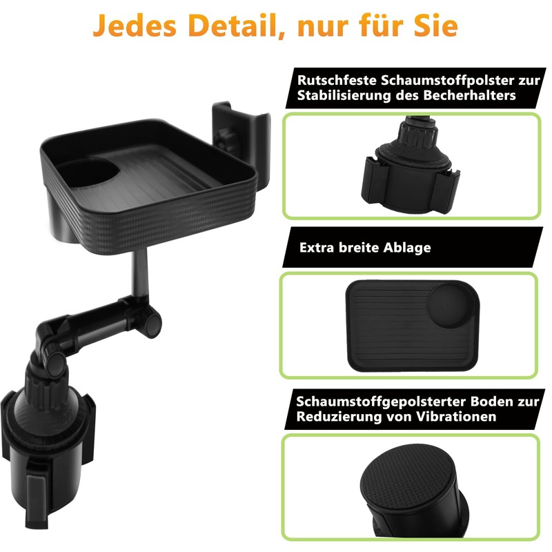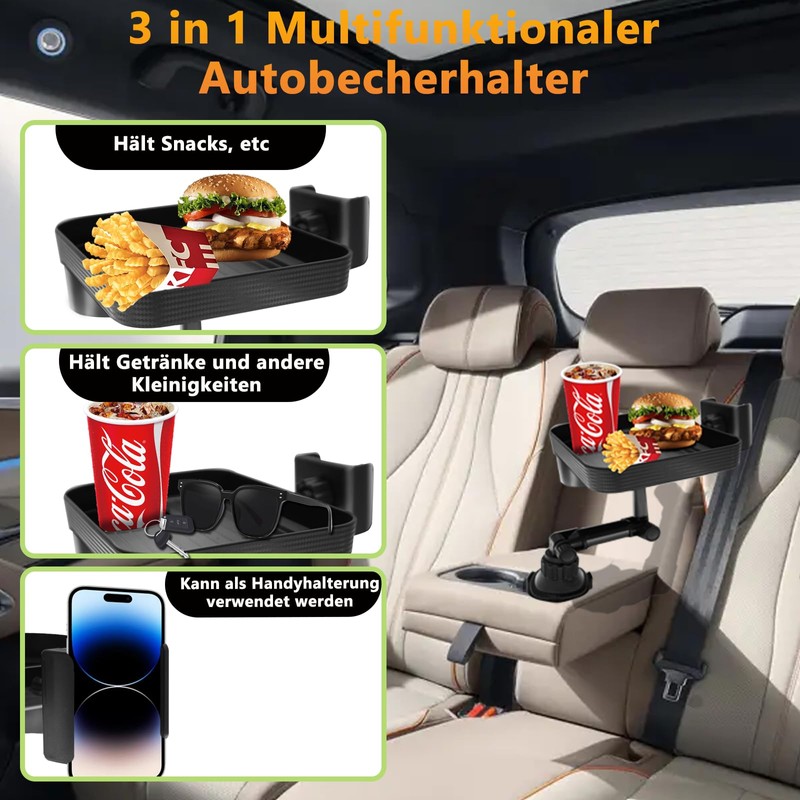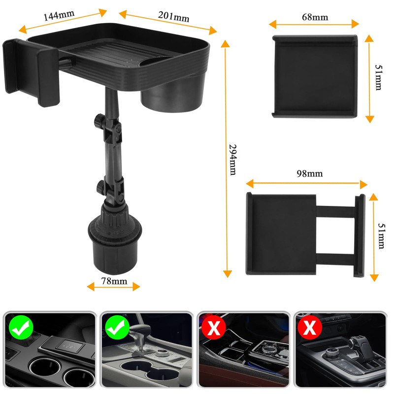 - Versatile car drink holder: transforms into a car organiser, car drink holder made of high-quality ABS plastic with an enlarged and wider shelf that can hold more items, can be easily transformed into an organiser for keys, coins, food etc. which frees hands and improves storage space. This is a must have car multifunctional table.