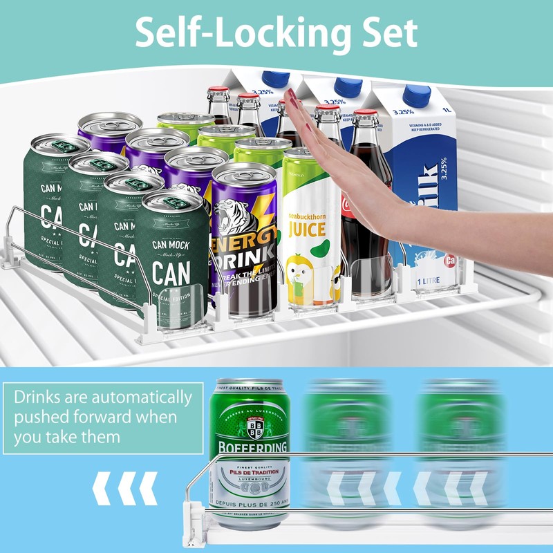 - Unique Design: The can organizer for pantry has been completely upgraded to automatically replenishable. The curved push plate fits the bottle body, so the beverage is not fall over when pushed, and the bottle body is not easily scratched. The innovative locking function allows the beverage to be properly placed and pushed even if there are less than 5 cans of beverage. With the upgraded spring push, the whole process is smooth, convenient and reliable to use.