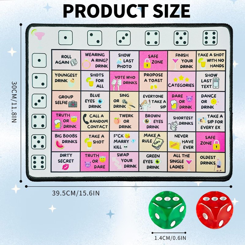 - Includes: 1 piece rubber drinking game mat, 2 dice. Game mat size: 15.75 inches L * 11.81 inches H. Recommended for ages 21 and above, with 2-8 people playing. This game is only for adults to play