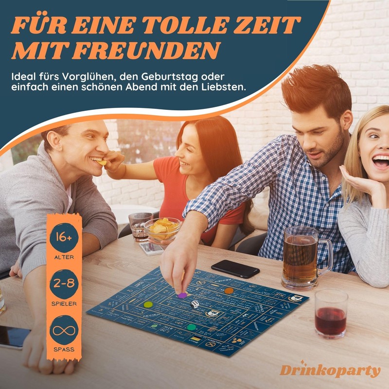 - The best party game since the invention of the cold drink - whether shared parties, pre-hot or birthday - Drinkoparty brings the mood, you get the drinks. On each of the 80 fields, there is for 2-8 players (more in the team) either something to laugh, drink or both.