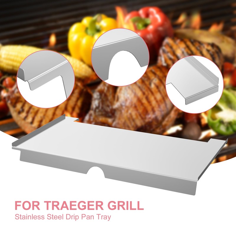 - BMMXBI Drip Pan Kit Replacement Parts Provides Even Heat for your Traeger Pellet Grill. The use of high-quality stainless steel materials is characterised by resistance to high temperatures, corrosion and durability, and is able to withstand long periods of high temperatures and heavy-duty use