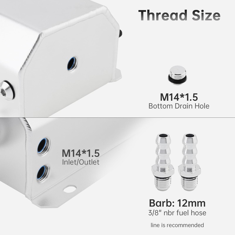 - Fitment: Universal coolant reservoir tank, fit for mostly of vehicles. Please measure before purchase to make sure there is enough space for installation. Size: The 2L capacity coolant overflow tank has 2*12 mm barb inlet and outlet ports. The thread size of the bottom drain and side port is M14*1.5.