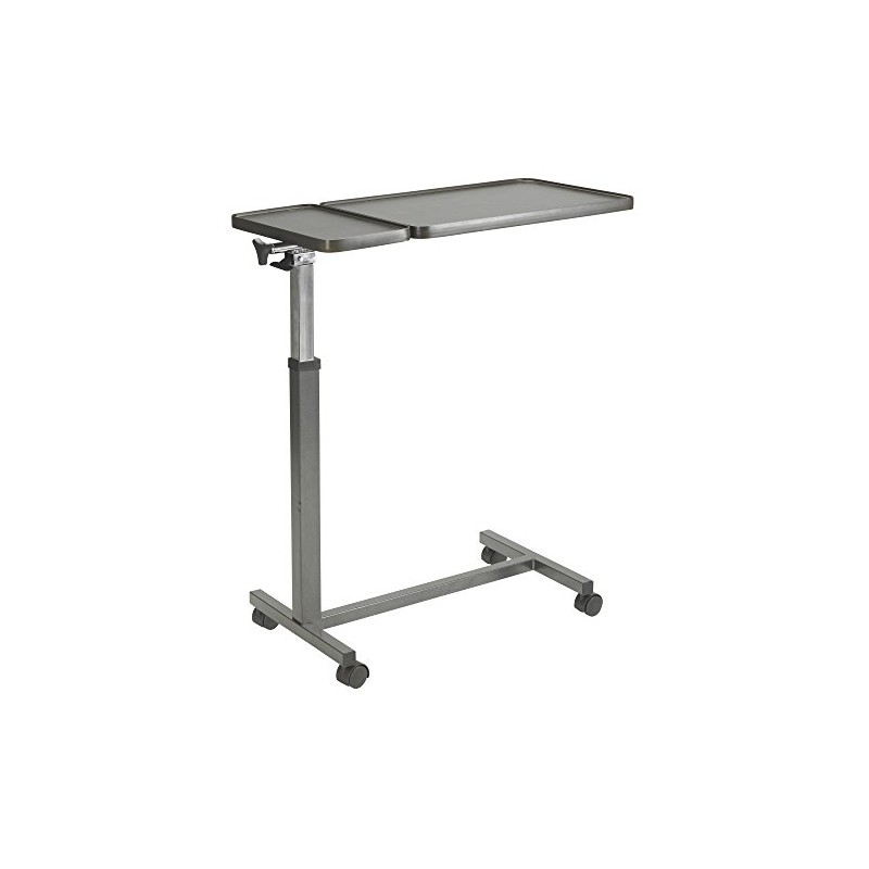 The Multi-Purpose Tilt-Top Split Overbed Table from Drive Medical gives you two stable, independent surfaces for eating, working, or entertainment. The height of the attractive wood-grain tabletops is infinitely adjustable and the larger surface can be angled to place it at the ideal position for you. The smaller surface always remains flat, perfect for keeping food, drink, glasses, remote controls, or other items secure. This Multi-Purpose Tilt-Top Split Overbed Table can also be used as a mobile workstation, a drafting table, a laptop desk, an artist's table, or an entertainment tray. With a 55 pound weight capacity, you can be assured your items will be safe and secure on this table. The tabletop can be raised as high as 46 inches allowing it to also be used as a standing desk. Additionally, the Overbed Table's caster wheels make it easy to maneuver and allow the table to be placed wherever it is most convenient.