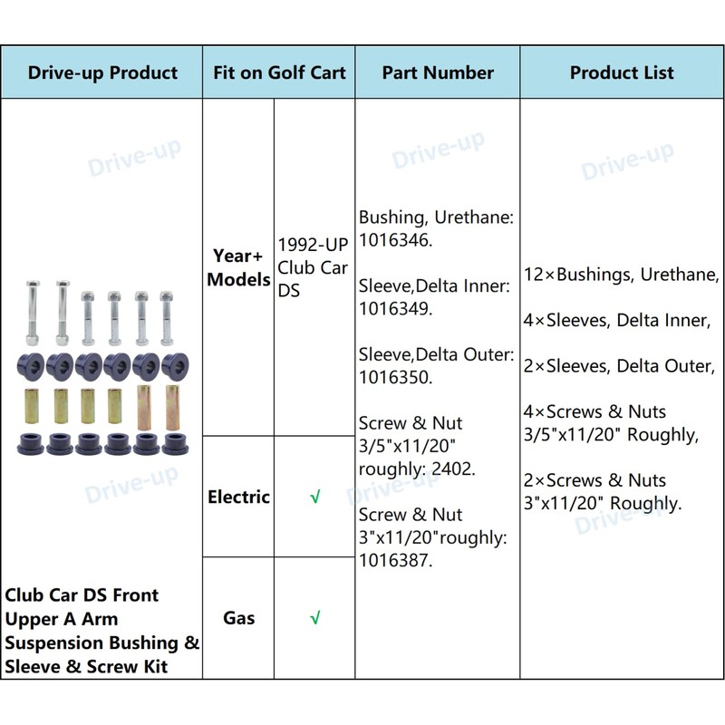- Bushing,Urethane (included 12Pcs),Replaces ClubCar OEM#1016346. Easy Installation & 1 year Warranty.
