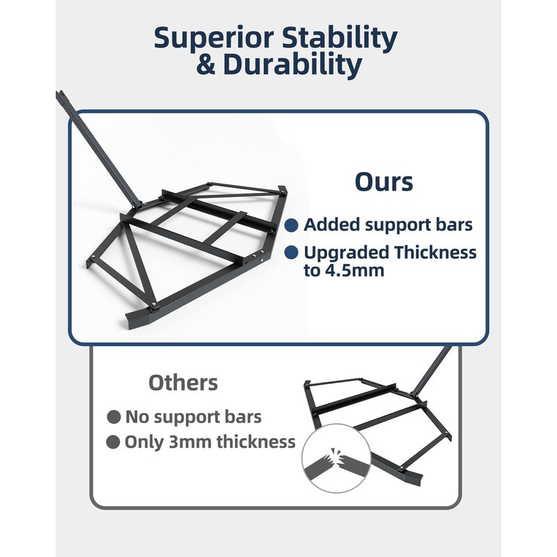• WIDE APPLICATIONS: Easily connects to most ATVs, UTVs, lawn tractors, and multipurpose tractors, making your towing work efficient and convenient. You can use it to level driveways, yards, fields, etc.