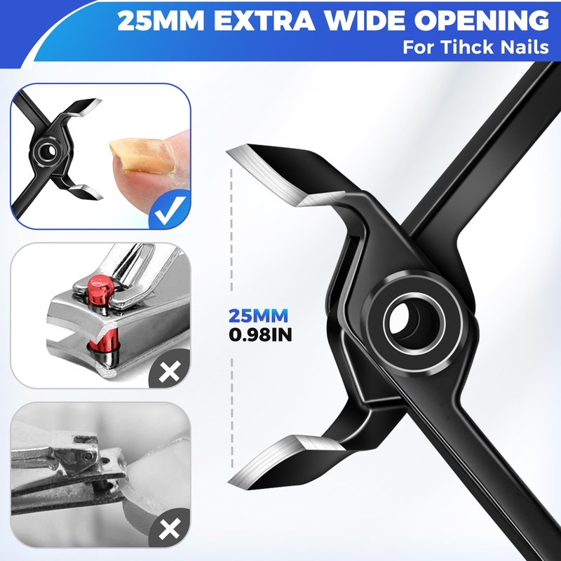 - IDEAL FOR THICK NAILS - The opening of thick toenail clippers is 6 times wider than the opening of normal nail cutter, and the wide jaws can be opened up to 25mm, so you can easily cut off thick and hard nails. Professional nail clippers are great for elderly, men, women and pet nails.