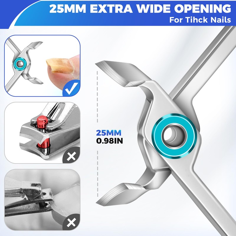 - IDEAL FOR THICK NAILS - The opening of thick toenail clippers is 6 times wider than the opening of normal nail cutter, and the wide jaws can be opened up to 25mm, so you can easily cut off thick and hard nails. Professional nail clippers are great for elderly, men, women and pet nails.