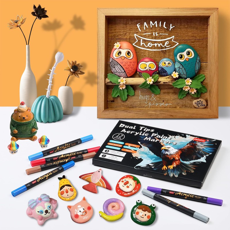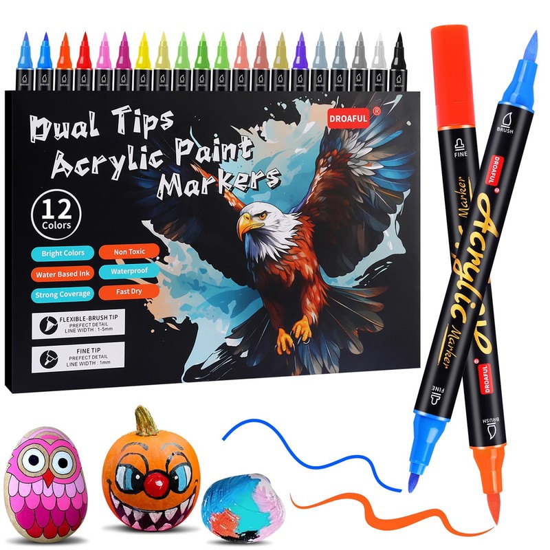 Droaful Acrylstifte für Steine Wasserfest, 12 Pc Acrylstifte Spülmaschinenfest Bemalen für Steinen, Porzellan, Glas, Leinwand, Keramik, Holz, Metall, Kunststoff, Schnelltrocknend, Ungiftig und Geruchsneutra