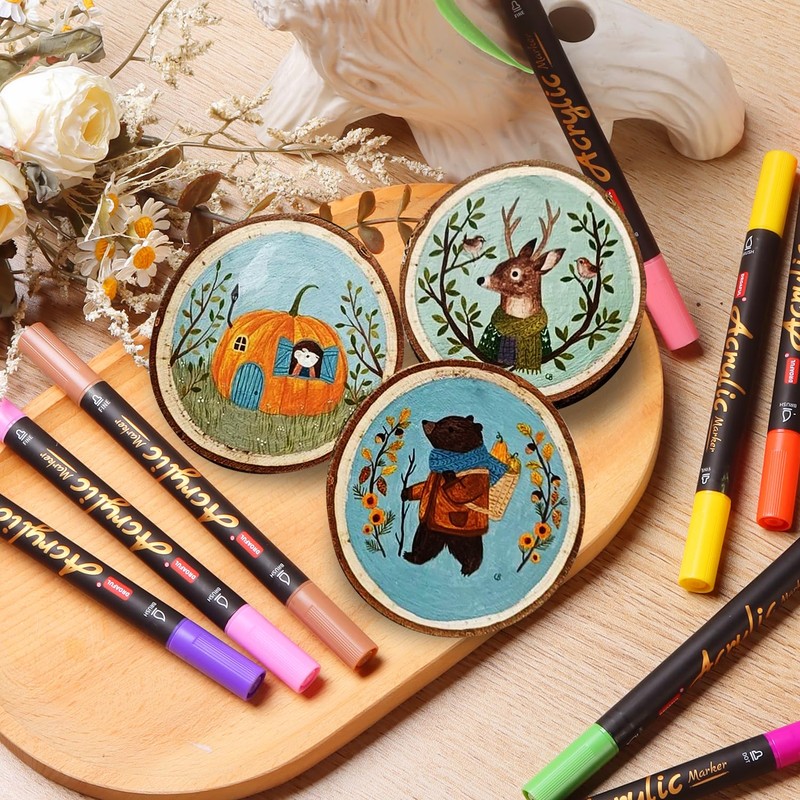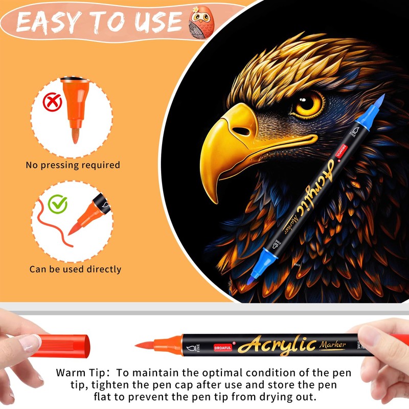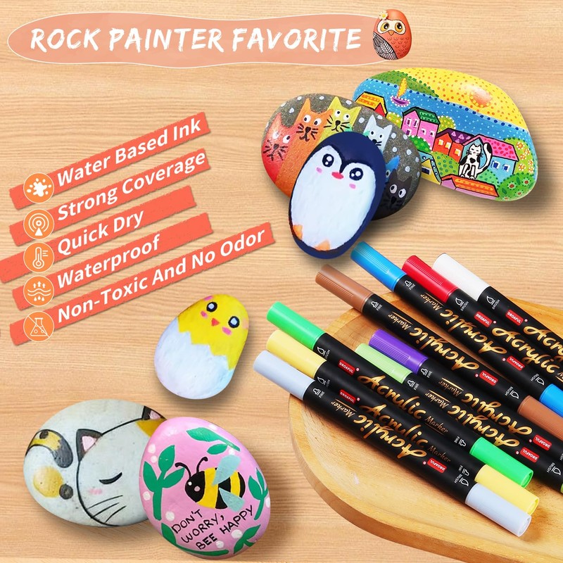 - Doppelspitzen-Acrylstifte: Jeder unserer acrylstifte für steine wasserfest ist mit einer 1-5mm Pinselspitze und einer 1mm feine Spitze. Die Feinspitze eignet sich perfekt für kunstvolle Arbeiten, die eine sorgfältige Kontrolle erfordern, während die Pinselspitze speziell für das Ausfüllen großer Flächen und das Hervorheben von Details konzipiert wurde. Sie können sie auch für Punktmalerei verwenden, um alle kreativen Anforderungen von filigran bis umfassend zu erfüllen, einen nahtlosen Wechsel zu ermöglichen und die Effizienz und den Spaß am Schaffen zu steigern.