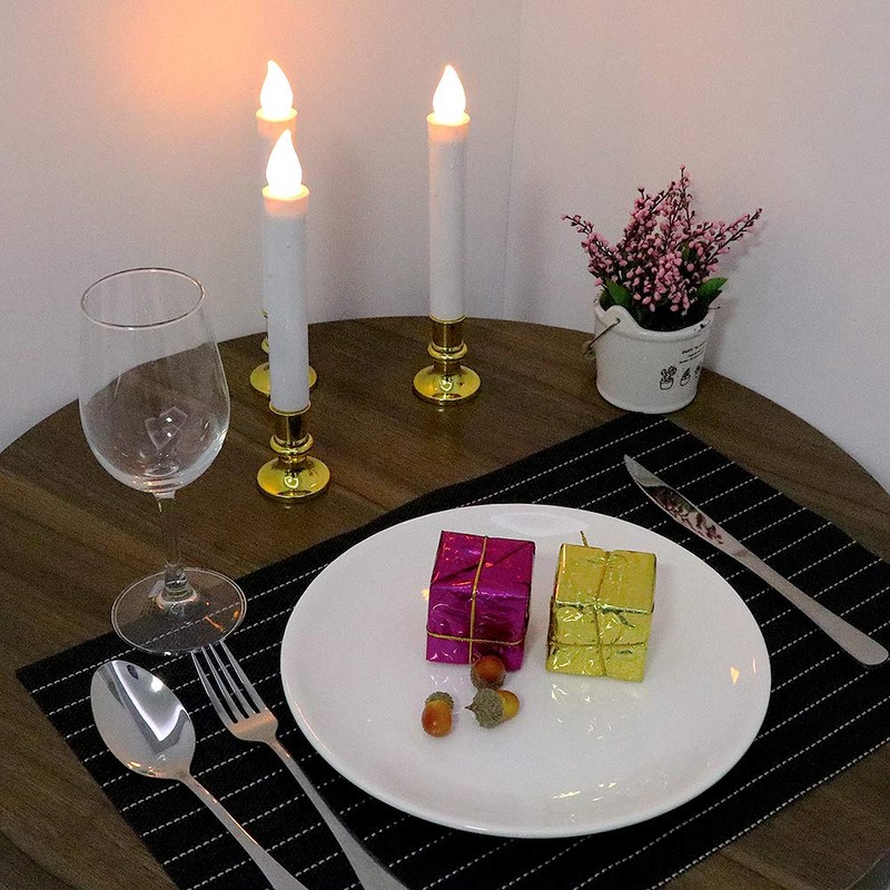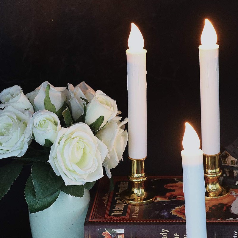 - Set of 4 flameless taper candles: All white flameless dripping taper candles are made by plastic with led flickering, removable gold holders and suction cups included, great addition to your Christmas home decor