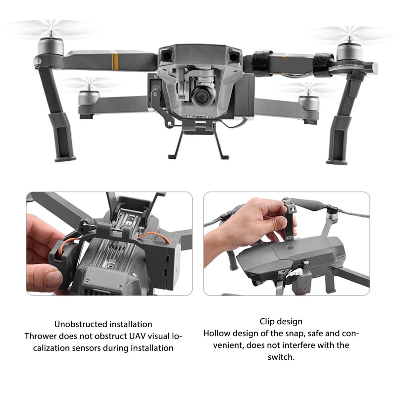 - Easy to install: the installation takes place in a few simple steps. The lower repair stand does not affect the propellers and sensors. Airdrop payload transport, delivery, release, drop device, drone launcher, airdrop drop system. Can be used for remote deliveries, e.g. For casting baits, throwing gifts, outdoors, sending wedding rings, etc.