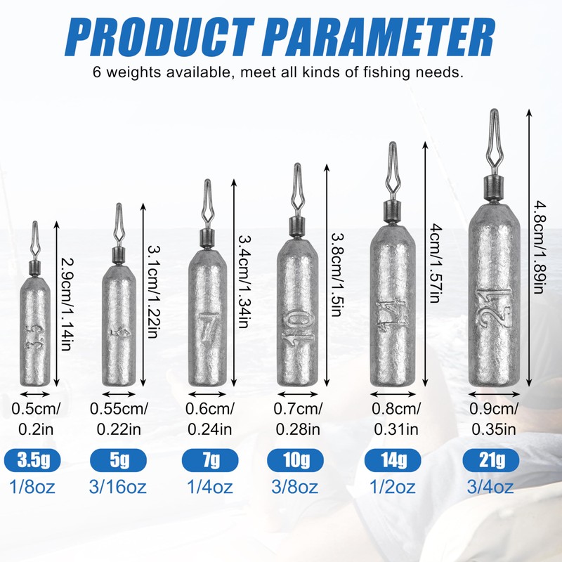 - 【Various Sizes】6 Size Available 1/8oz,3/16oz,1/4oz,3/8oz,1/2oz,3/4oz,Pencil weights fishing sinkers can meet all kinds of fishing needs,whether fishing in rivers,lakes or the sea.