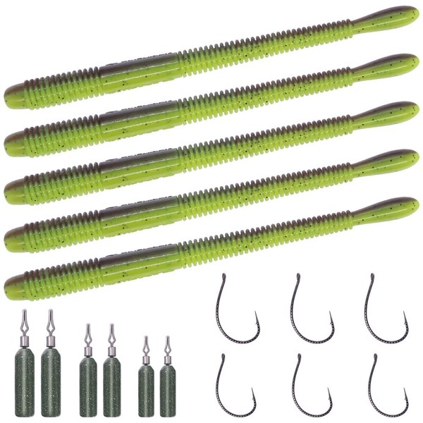 Drop-Shot-Rigs-for-Bass-Fishing-Soft-Plastic-Lures-Worm Fishing Hooks, 4.5 inch Rubber Worms, Wacky Worms, Straight Tail Stick Baits -22 Piece Kit with 10 Bodies, 6 Hooks, 6 Weights