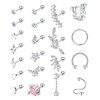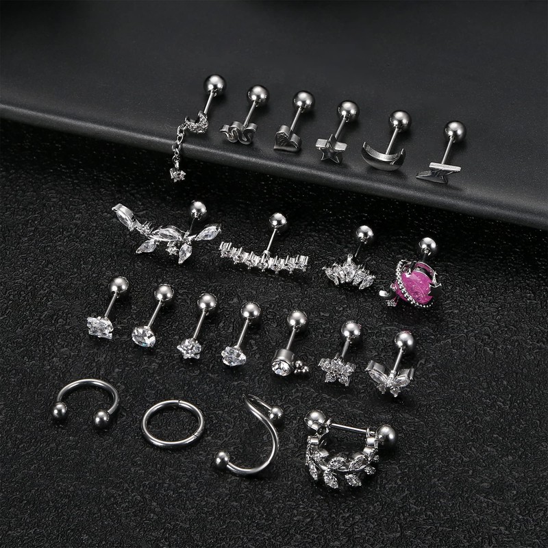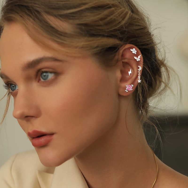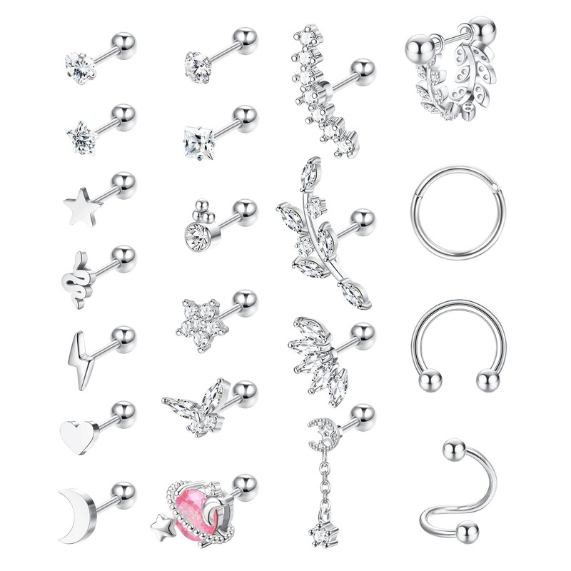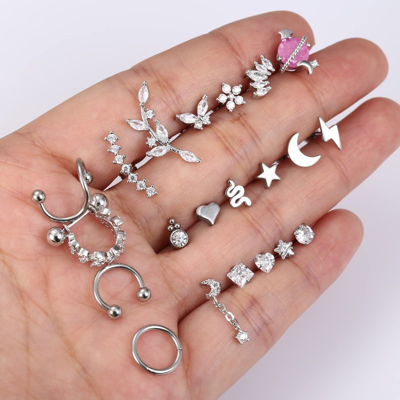- Cartilage Earring Set --- Silver cartilage earring set includes 21pcs cartilage piercing: cz, star, moon, lightning bolt, snake, heart, flower, butterfly, saturn planet, leaf curved dangle cartilage stud earrings, leaf barbell cartilage earrings, hinged cartilage hoop earring, horseshoe cartilage earring and spiral cartilage earring, cute cartilage earrings for women.