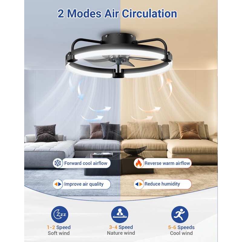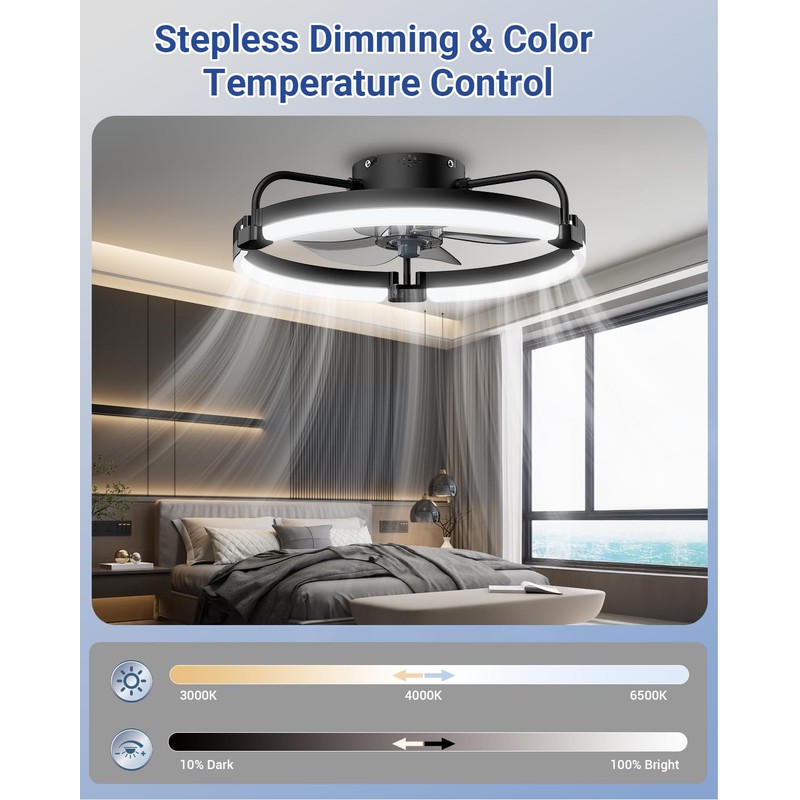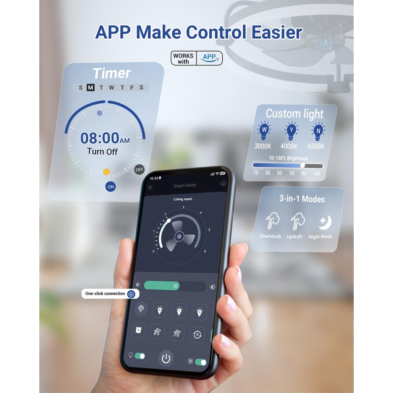 - 【Smart Remote and App Control】This modern ceilng fan can be easily controlled by remote control or APP for brightness, color temperature, fan speed and timer. Besides, the ceiling fan and light can be controlled separately for all your needs.