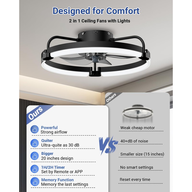 - 【Timer & Memory Function】This low profile ceiling fan with light can be set on a 1h/2h/4h/8h timer via remote control or APP. Besides, it is equipped with a memory function so that when you use it next time, it will automatically turn on the last setting.