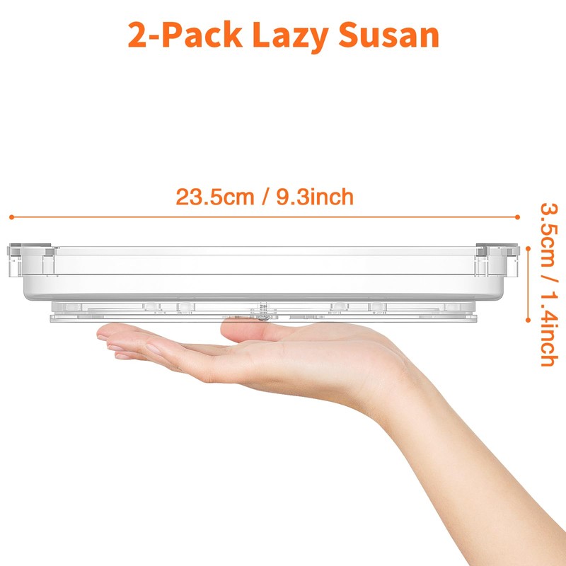 - Pack of 2 turntable fridge: turntable organiser measures 23.5 cm x 3.5 cm. Turntable organiser easily store different types and sizes of items. No drilling is required and it can be conveniently placed on a worktop or in a cabinet.