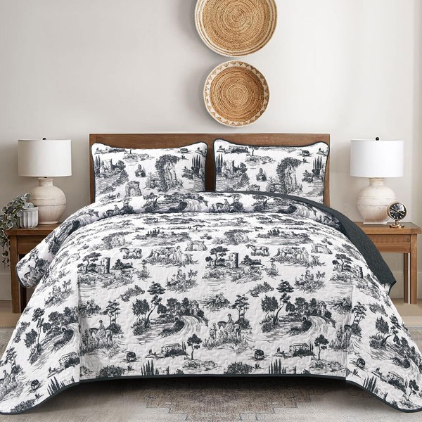 Drucon Black Farmhouse Quilt Set King Size, Toile Rustic Bedspreads, 3 Pieces Village Landscape Printed Coverlet, Soft Microfiber Quilt Bedding Set for All Season (106x90 Inch)