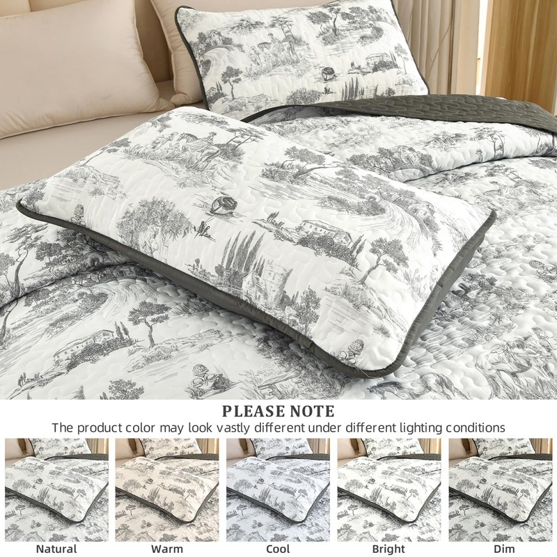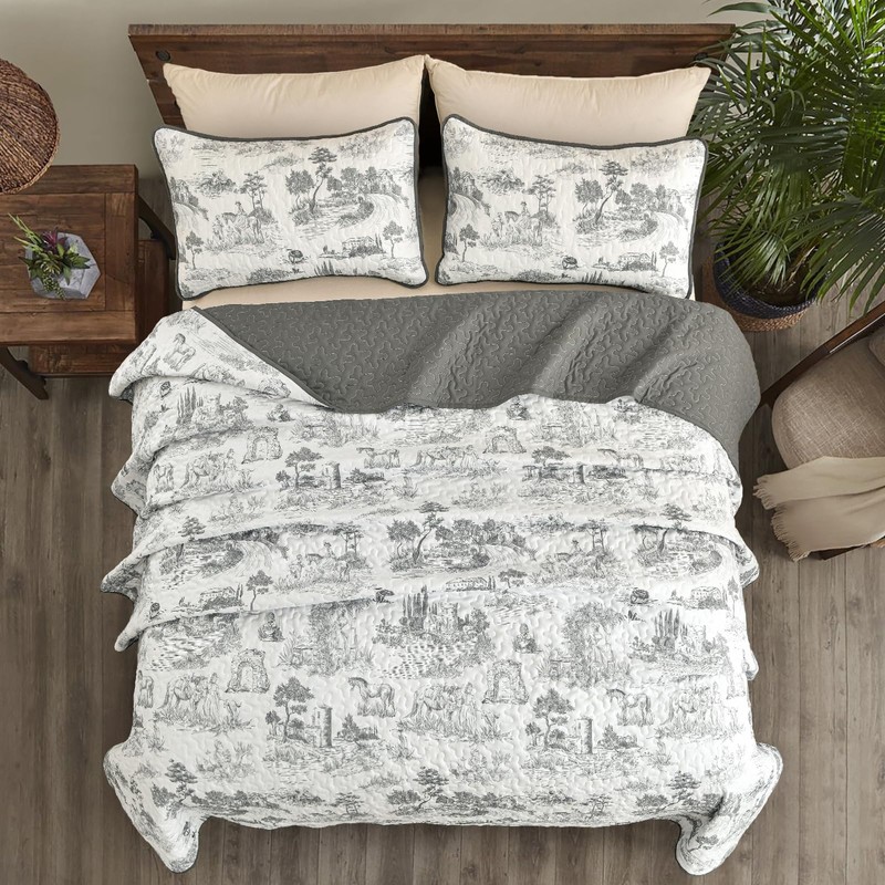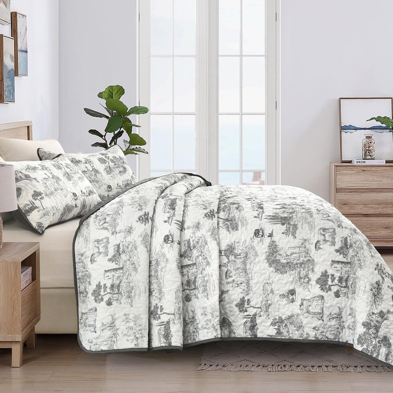 - Multi Use Bedspread: Grey Toile coverlet set is suitable for year round use. With premium craftsmanship, exquisite stitching and seams on all edges, this warm yet lightweight quilt set is suitable for hot summer eves and delivers essential supplementary warmth in the winter