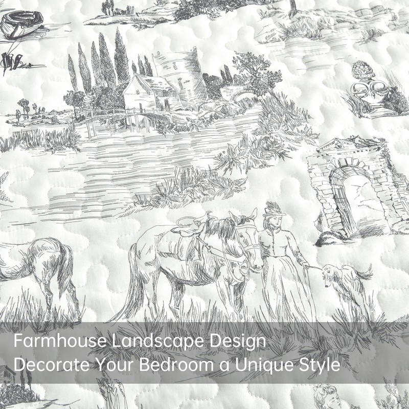 - Farmhouse Toile Design: Village landscape patterns printed, this farmhouse quilt set will light up your room. Digital printing makes all patterns bright and vivid. Farmhouse style and exquisite patterns add elegance and sophistication to your bedroom