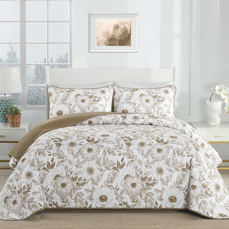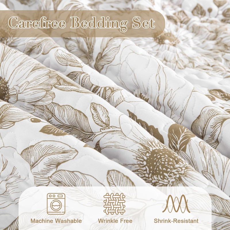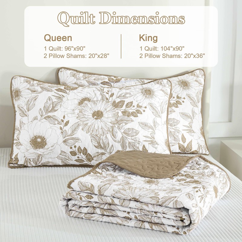 Drucon Khaki Floral Quilt Set King Size 3 Pieces Botanical Quilt Coverlet Set with 2 Pillowcases Lightweight Soft Microfiber Bedding Set Bedspread for All Season 104"x90"