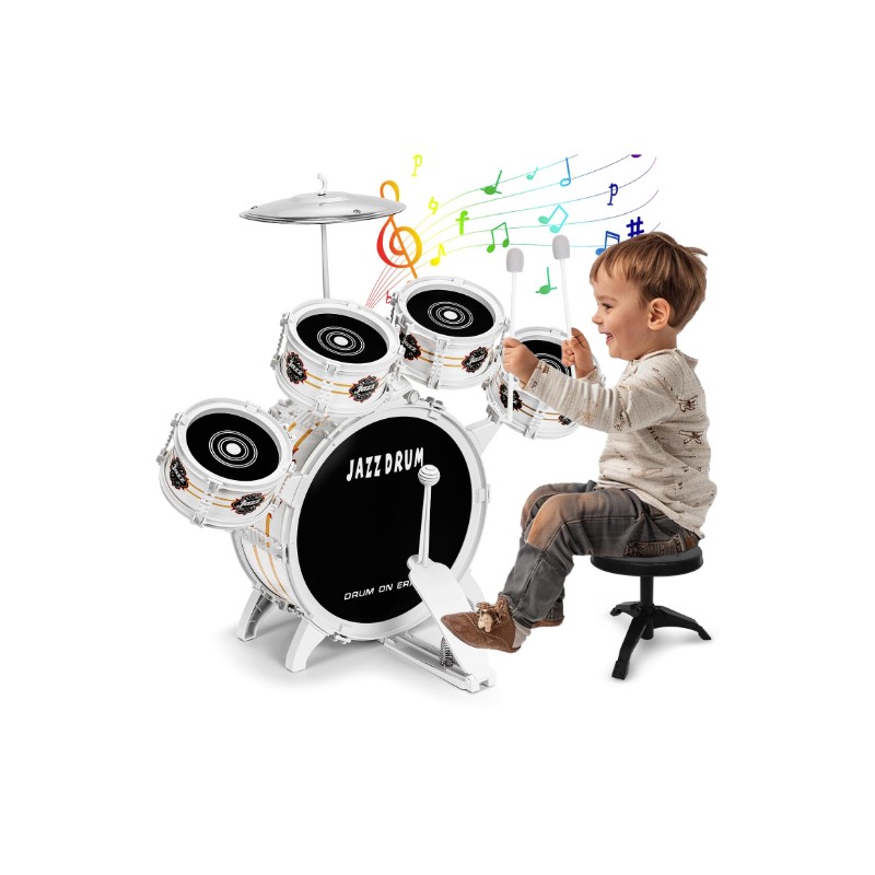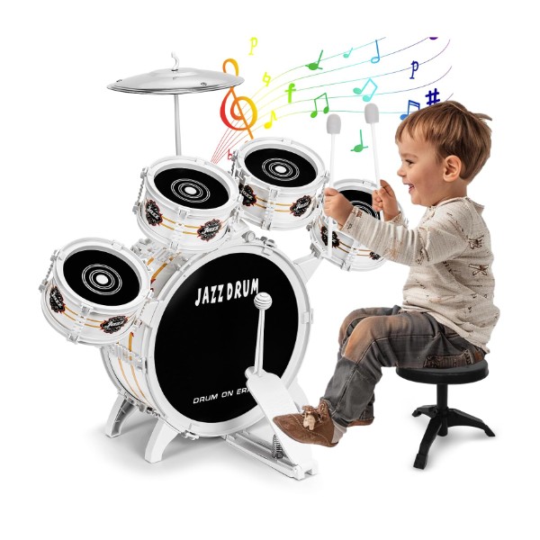 Drum Set for Kids --- 5 piece drum set designed for kids to develop hobby and inspire talent of music, including 5 drums, 1 cymbal, 2 drum sticks and 1 stool. This drum set kit is ideal for toddlers aged 1-3 3-5 who want to explore the world of percussion.