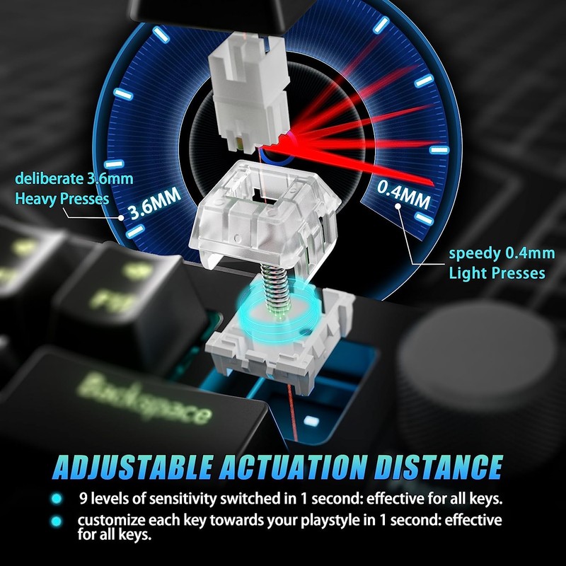 - Adjustable Working Distance: DrunkDeer magnetic linear switch allows for custom action from 0.02 to 0.14 inches (0.4 to 3.6 mm). You can switch between 9 levels in 1 second depending on your input status