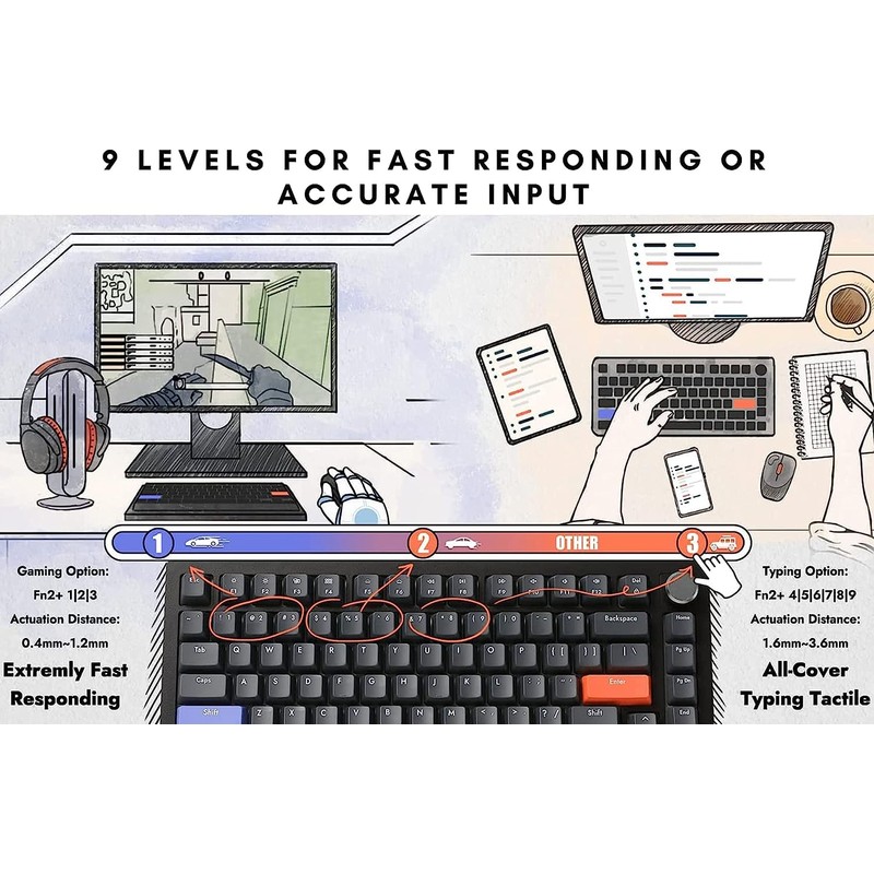 - Rapid Trigger: The key action is smoothly adjusted, allowing for mid-motion repeat without securing the action points. Provides faster response than traditional keyboards. Players can freely customize them according to their needs. Valorant, osu! such as FPS and rhythm games to give you the edge