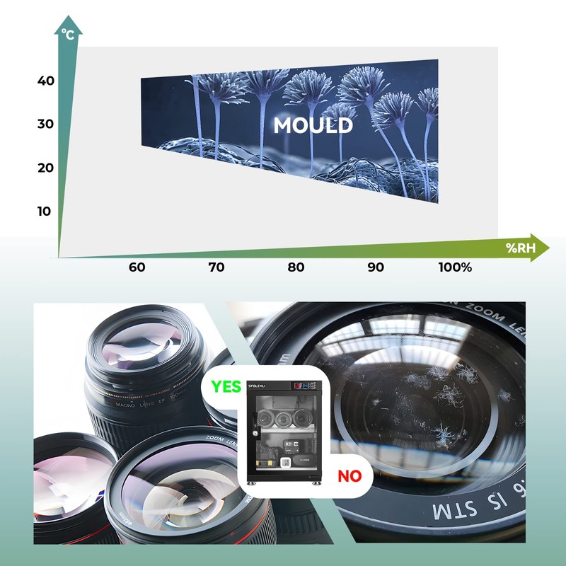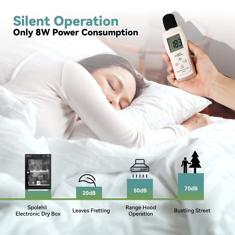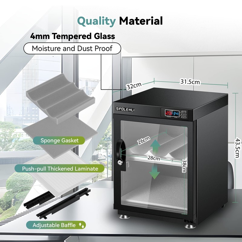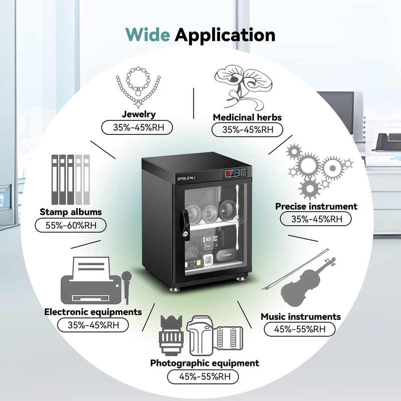 - 【High Accuracy Humidity Control】Humidity control of Spolehli camera dry cabinet is extra accurate, ranging from 25% to 60% with ±3% differs, which is wide enough to preserve most of the items (camera, instrument, stamps, tea, electronic components, handbags, etc.