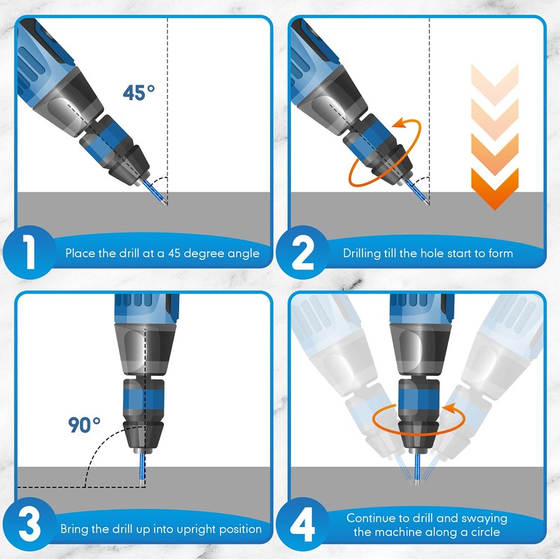 3.You don't need to apply too much pressure to let the drill finish the work. Once the drilling is completed, you will feel the drill break through the back of glass or ceramic tile