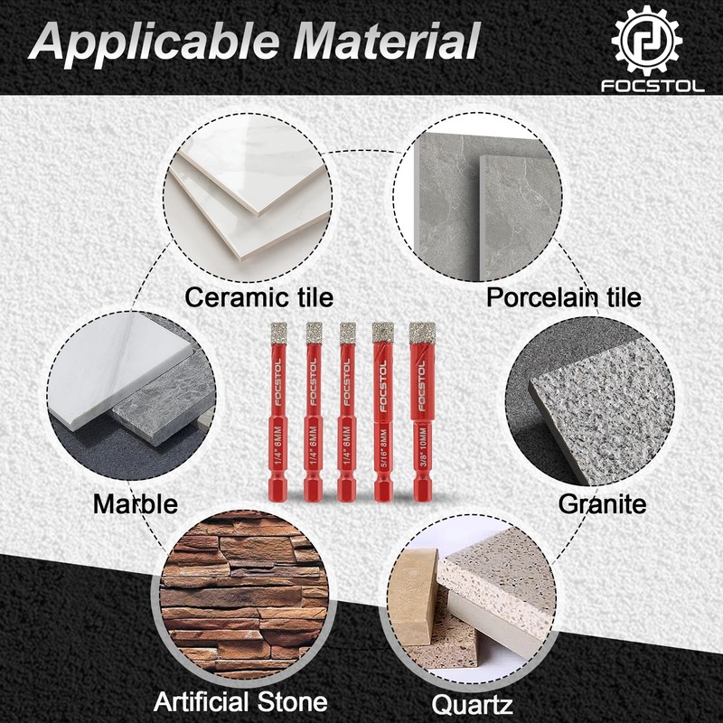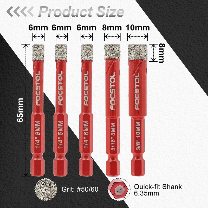 Dry Diamond Drill Bits Set - FOCSTOL 5pcs 6/6/6/8/10mm Diamond Hole Saw Kit with Quick Change Hex Shank for Ceramic Porcelain Tile Marble Granite Quartz
