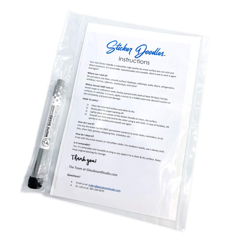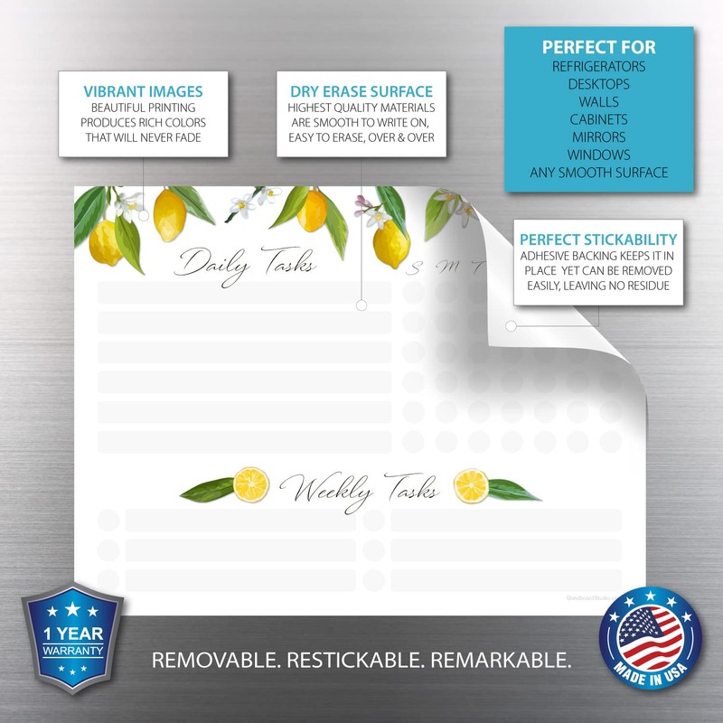 This dry erase task planner is perfect for staying on top of your daily and weekly responsibilities, habits, or goals. Just use your included fine-tip dry erase marker to fill in your tasks and check them off as you complete them, and you'll instantly become an organizational genius. The bright, colorful, contemporary designs make it fun to stay on top of your goals. We use the highest quality dry erase lamination materials, making it smooth to write on and easy to erase completely. The adhesive backing sticks to any clean, smooth surface, including refrigerators, desktops, cabinets, mirrors, walls, windows, and much more. Even better, it can be easily removed, leaving your surface intact and residue-free. Use it with the included magnetic fine-tip dry erase marker or with any other dry erase markers. Glassboard Studio is committed to making sure every customer is happy with their purchase. We inspect each of our products thoroughly to be sure it meets our quality standards. Each has a different design, theme, and purpose. Some of the other options we provide include weekly calendars, monthly calendars, vision boards, weekly schedules, beautiful landscapes, scenic views, fitness charts, and more. Use our products as meaningful gifts, organizational tools, decor in your own home, wedding decorations, family pictures, chore charts for your kids, and more. Brighten up your home and make organization a priority with Glassboard Studio's Sticker Doodles!